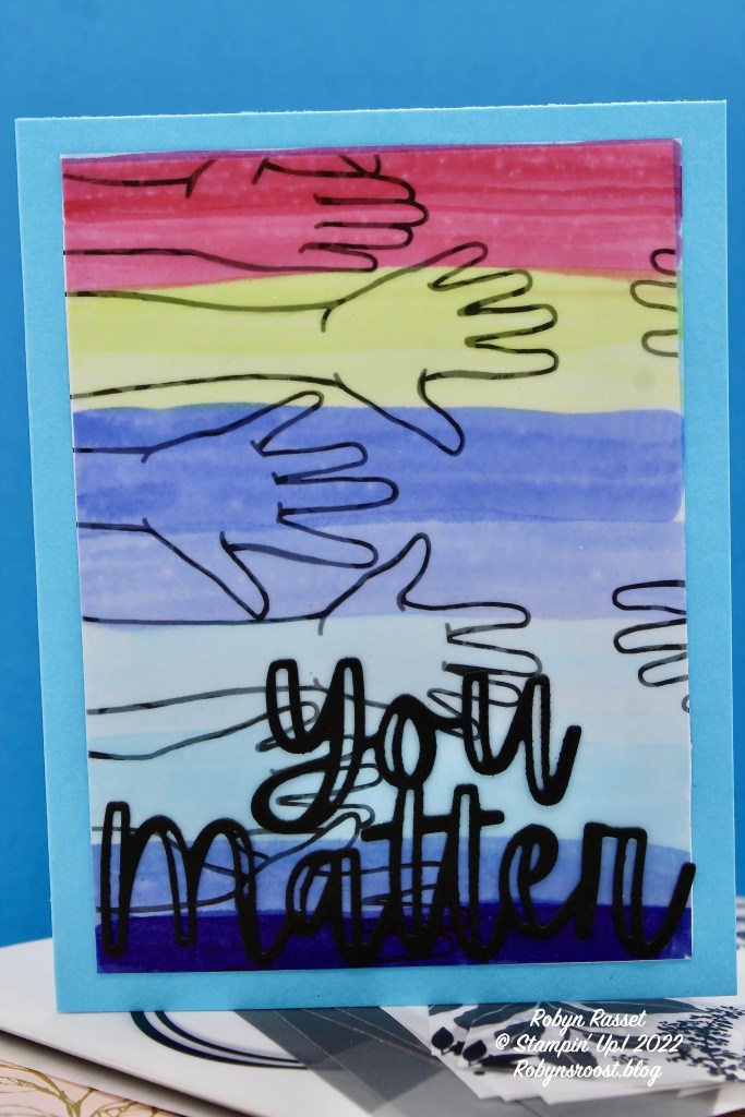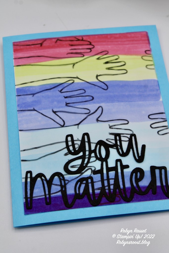 After coloring, the vellum is then layered over a piece of the All Together Designer Series Paper. The All Together Designer Series Paper is a black and white paper and is perfect for a colored vellum overlay. The words are die cut from the Here For You Die set from Basic Black cardstock.
