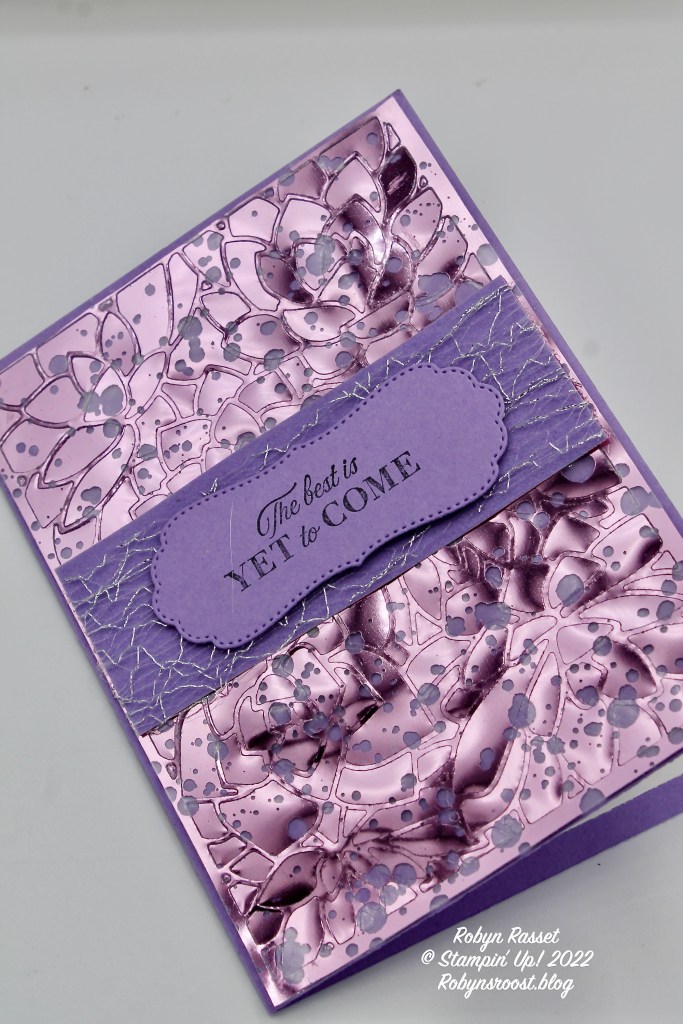 The greeting is from the Celebrating You stamp set and the label dies from the Succulent Dies work perfectly with the greetings in the Celebrationg You stamp set. I’ve wrapped a piece of the Metallic Woven Mesh Ribbon around a piece of Velveteen Paper. The Velveteen Paper is no longer available but a piece of the Highland Heather cardstock would work as well.