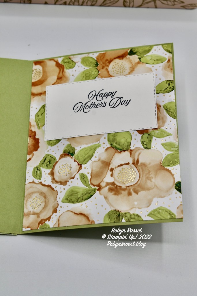For the inside of the card, I added a 5 3/8″ X 4 1/8″ piece of designer series paper. I don’t usually do this, but I wanted this card to be special. Although the awesome, Expressions in Ink Designer Series Paper is all sold out, be sure to check out the Hues of Happiness or Awash in Beauty Designer Papers in the New 2022-2023 Annual Catalog which is available to order starting May 3. Either one would be a pretty substitute.
