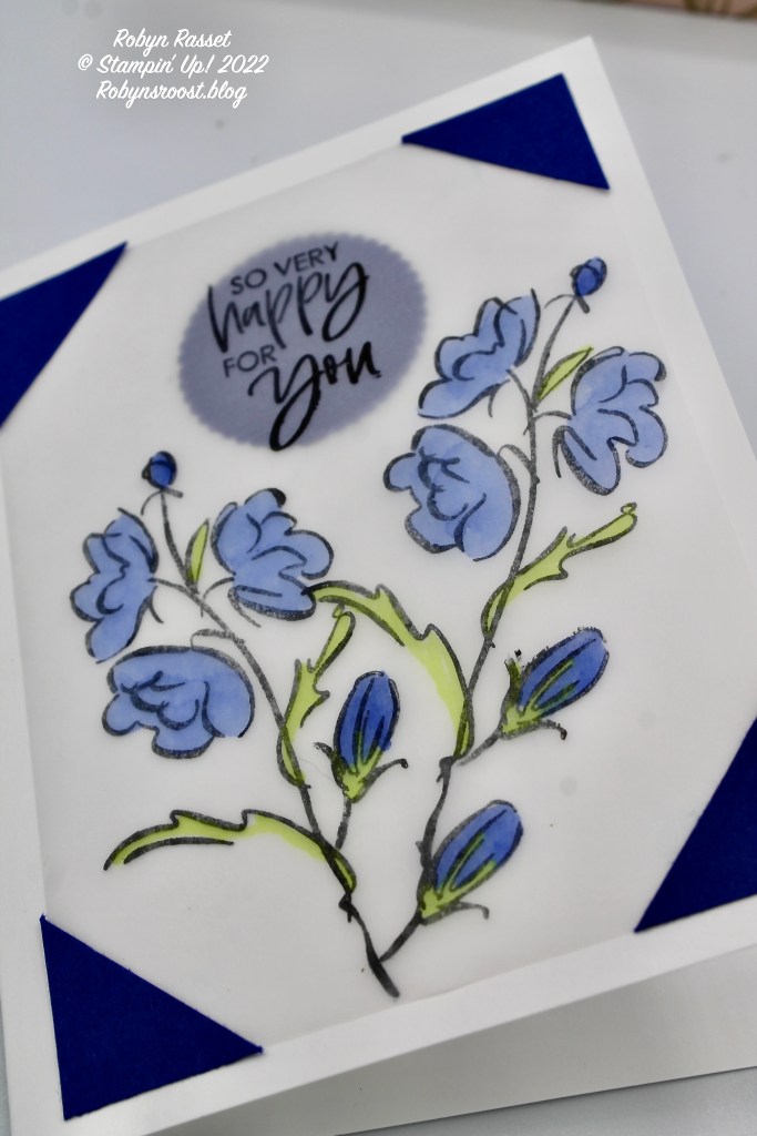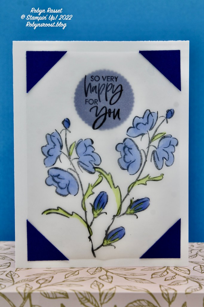 The vellum was adhered to the card front with Stampin’ Seal on the corners and to cover the adhesive two one inch squares of Starry Night cardstock were cut diagonally and glued over the corners of the vellum. A die cut circle was also adhered to the card front before the vellum was added to make a shadow behind the greeting.