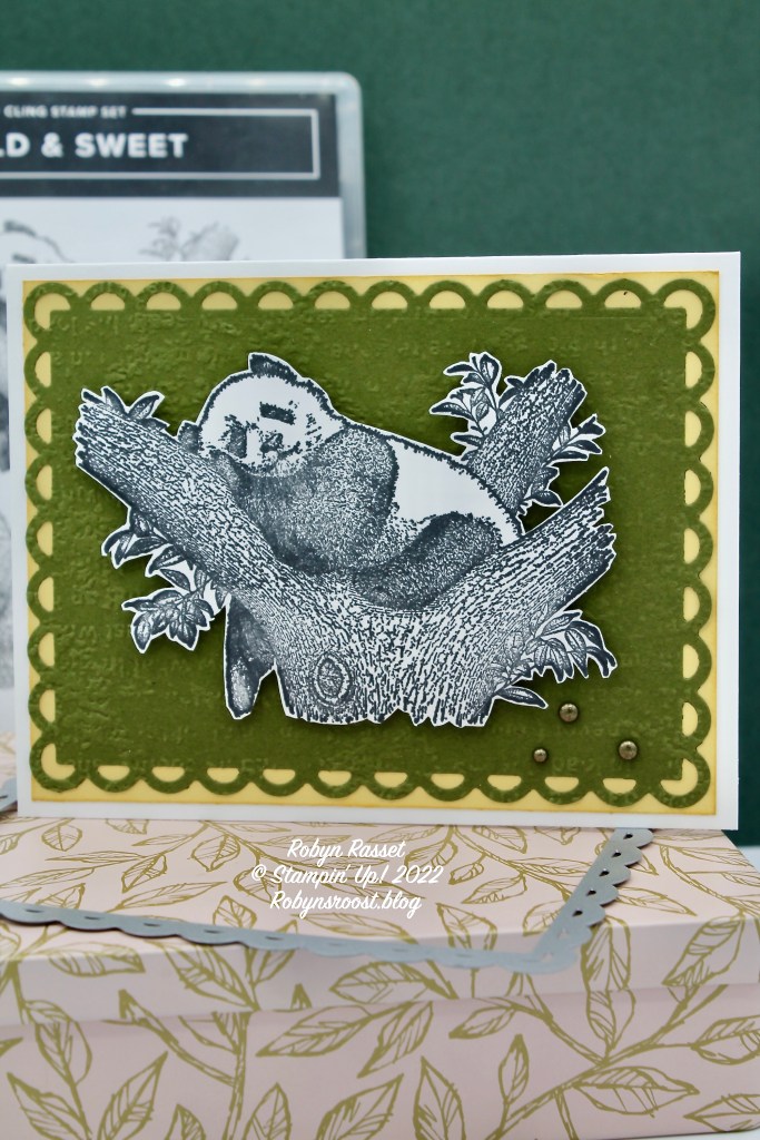 Here is an example of what the card looks like when colored using Watercolor Pencils. There was no water added, the pencils were used dry. No coloring was added to the panda, only the tree and leaves.