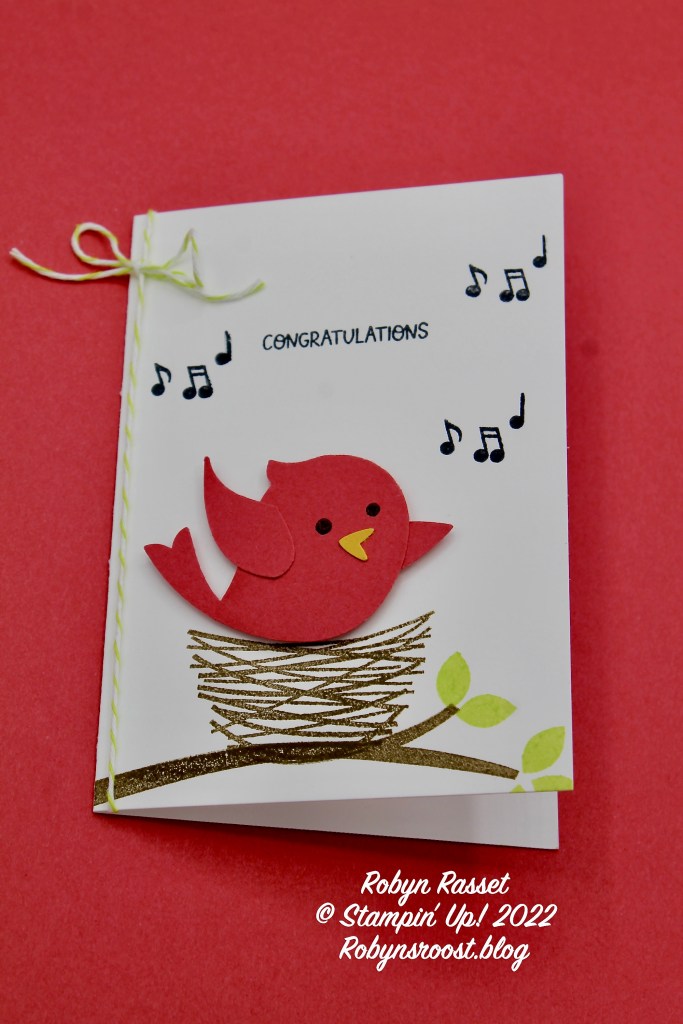 We used the Songbird Builder Punch to create the bird from Sweet Sorbet cardstock. Sweet Sorbet is one of the new 2022-2024 In Colors. I love that the Sweet Songbird stamp set has 2 different choices for the birds eyes! The bird is popped up with dimensionals. The leaves and the ribbon are also a new In Color, the Parakeet Party color.