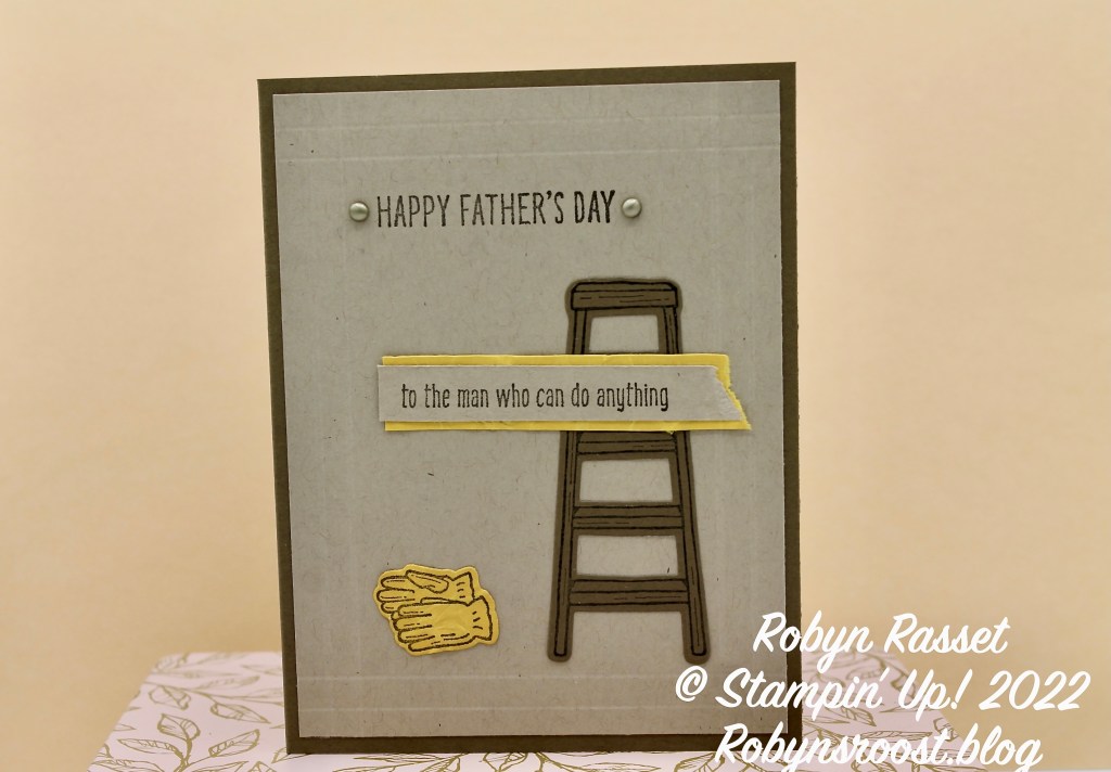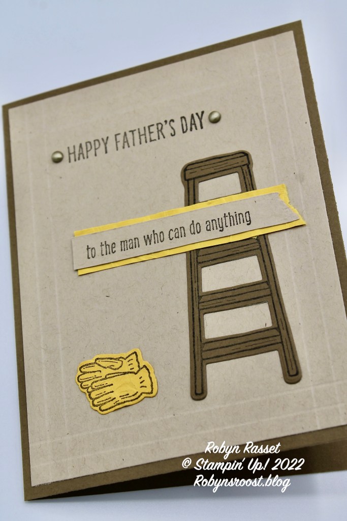 The ladder is stamped with Early Espresso ink onto Soft Suede paper and then die cut with the matching die. To make the gloves look like the soft fuzzy chore gloves that my husband likes, I stamped using the Early Espresso ink onto a scrap of Crushed Curry, then after die cutting the gloves, I scrunched and folded them and then scrunched and folded again, until the paper looked soft and worn. The matting layer under the greeting was also scrunched and folded, plus the one end was torn to give it interest. Our neighbors always joke about 1-800-CALL-GARY whenever something broke because my husband is one of those guys who can fix anything. So I really liked this greeting!