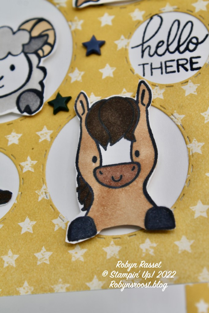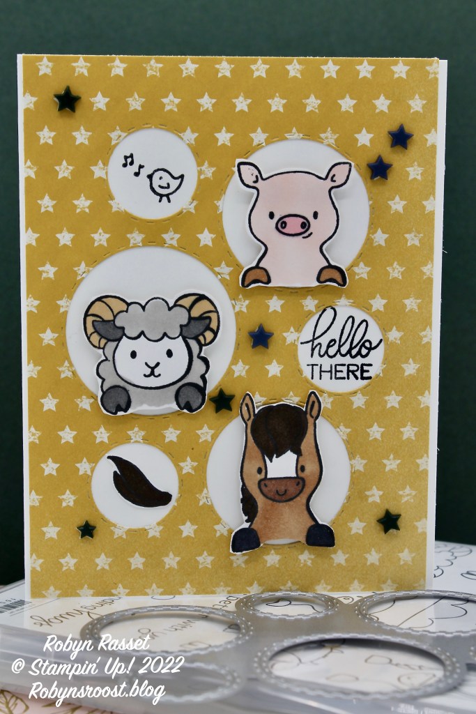 This version of the card has the animals stamped directly onto the card front inside of the circles. I adhered the die cut layer of designer paper first, then used a post it note as a protective mask, to cover up the bottoms of the holes while I stamped the animals so that the hooves didn’t get stamped onto the designer paper. Then I stamped the hooves only, onto a scrap of basic white, colored and fussy cut them out. The only thing I didn’t like about the way this card worked was that the Stampin’ Blends bleed through the paper and showed on the inside of the card. The circles that were removed from the die cut holes could be used to cover the bleed through on the inside of the card or a patterned paper piece could be add to the inside front. The designer paper and embellishments used on this version are retired items, but I wanted to show you the another way that the animals can be stamped directly in the circles.