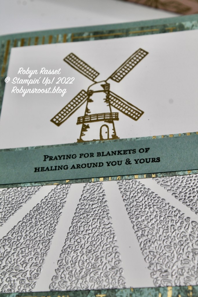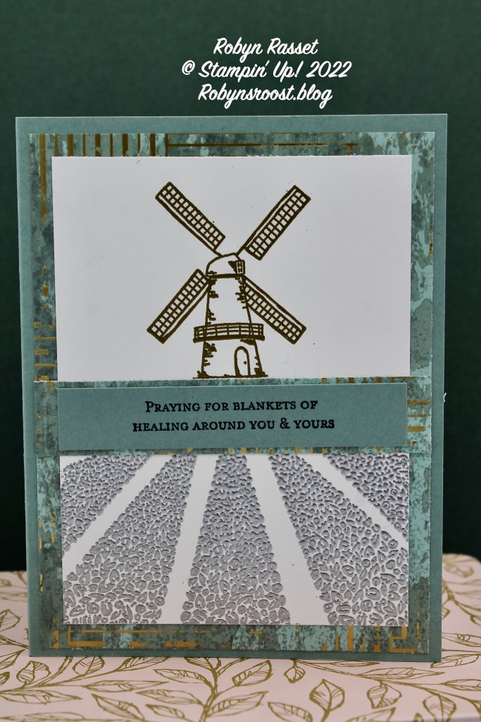 I wasn’t sure how silver tulips would look, but I like it. I makes me think of sunset, right before it gets really dark when everything turns shadowy. My tulips out in the gardens are almost all done blooming. Gosh, they never last long enough, do they? Time to cut them down and plant summer flowers. For the greeting, I decided to use the Through It Together stamp set. This has become one of my go to greeting sets. It has 21 greetings geared to support and encourage.