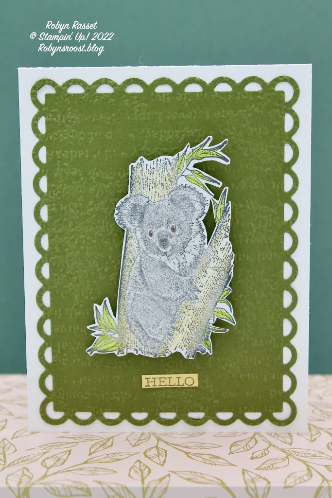 The koala is one of three cute animals in the Wild & Sweet stamp set. This little guy is colored using the Watercolor Pencils without any water or blending. There isn’t a matching die set for the Wild & Sweet animals so I did need to fussy cut him out. The mossy meadow background layer was die cut with the Scalloped Contours Dies then run through the Stamp Cut and Emboss Machine a second time with the Timeworn Type 3D Embossing Folder. The little Hello greeting is from the Expressions of Friendship Hostess set from the January to June Mini Catalog which will be retiring at the end of this month.