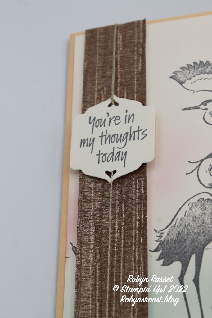I love the die cut greeting label from the Heron Dies! Aren’t the little heart cut outs cute? I added a piece of Linen Thread woven through the hearts and wrapped around the gold layer. All of the images and the greeting are stamped using Basic Gray ink. The horizon line was added using a Basic Gray Stampin’ Write Marker. The herons are stamped onto a piece of 4″ x 5 1/2″ Very Vanilla cardstock. The card base is Pale Papaya.