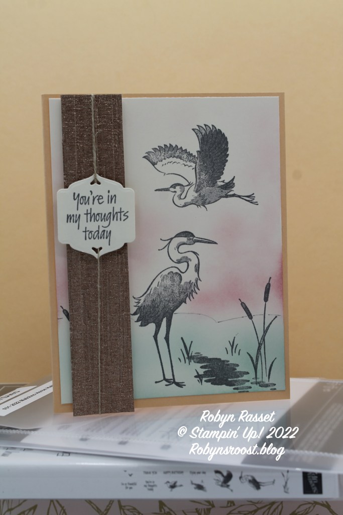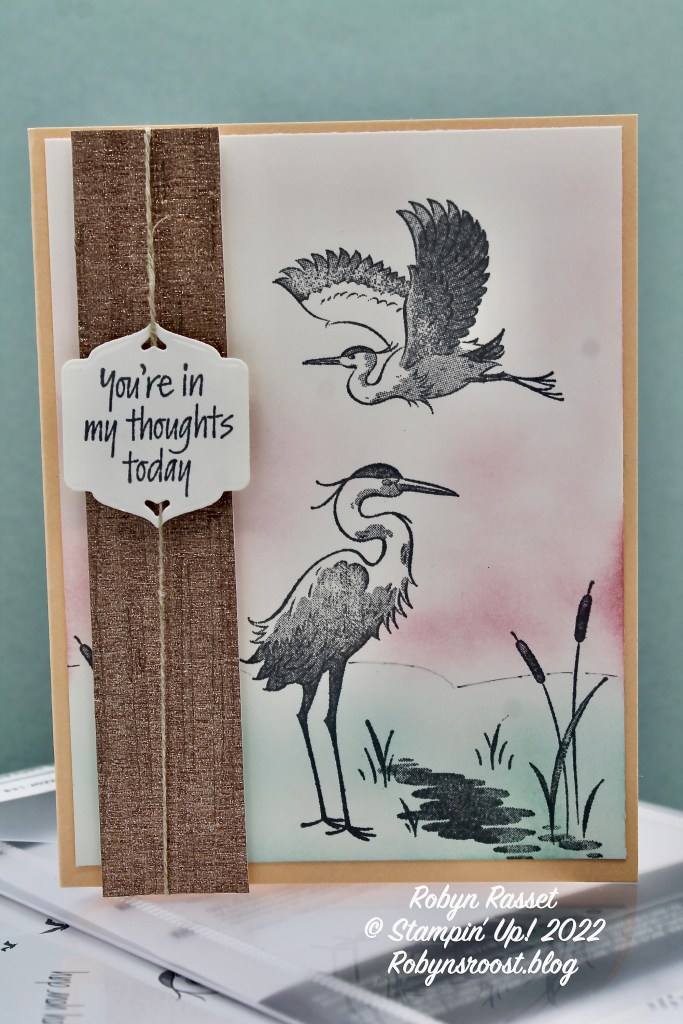My Heron Habitat card is for Pin #4 Mixer. It uses a piece of the Gold & Rose Gold Metallic Speciality paper from page 139 of the catalog. This paper is so pretty that I almost hated to use it! It is embossed with the stripes embossing folder from the Splatters and Stripes Embossing Folder Duo. The Splatters and Stripes Embossing Folders come in a two pack and fit in the Mini Stamp Cut & Emboss Machine. The strip is 1″ x 5 1/2″ and is adhered to the card front with Stampin’ Dimensionals.