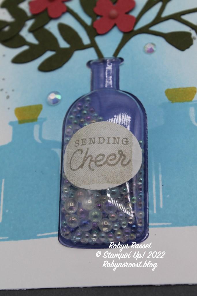 I was not planning on purchasing the Bottled Happiness stamp set and Vintage Bottle Punch…then I used someone else’s at a stamping get together…OMG…had to have it and now it’s one of my favorites. I make a lot of cards, some don’t turn out, some are okay, most are good, but occasionally, I make one that I fall in love with, this card is one that I adore!