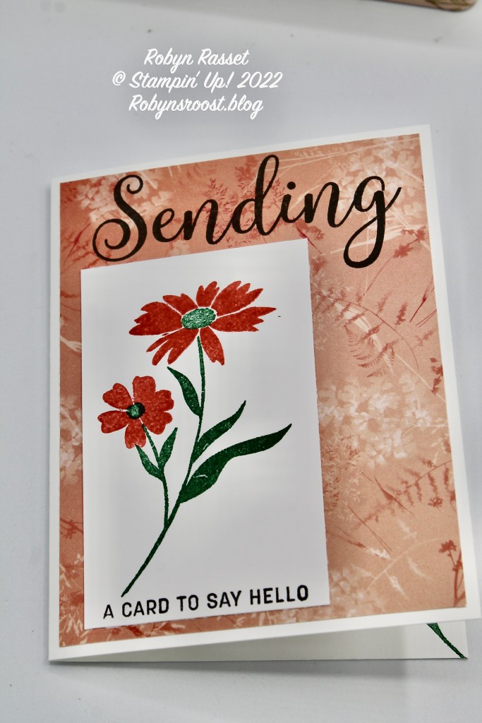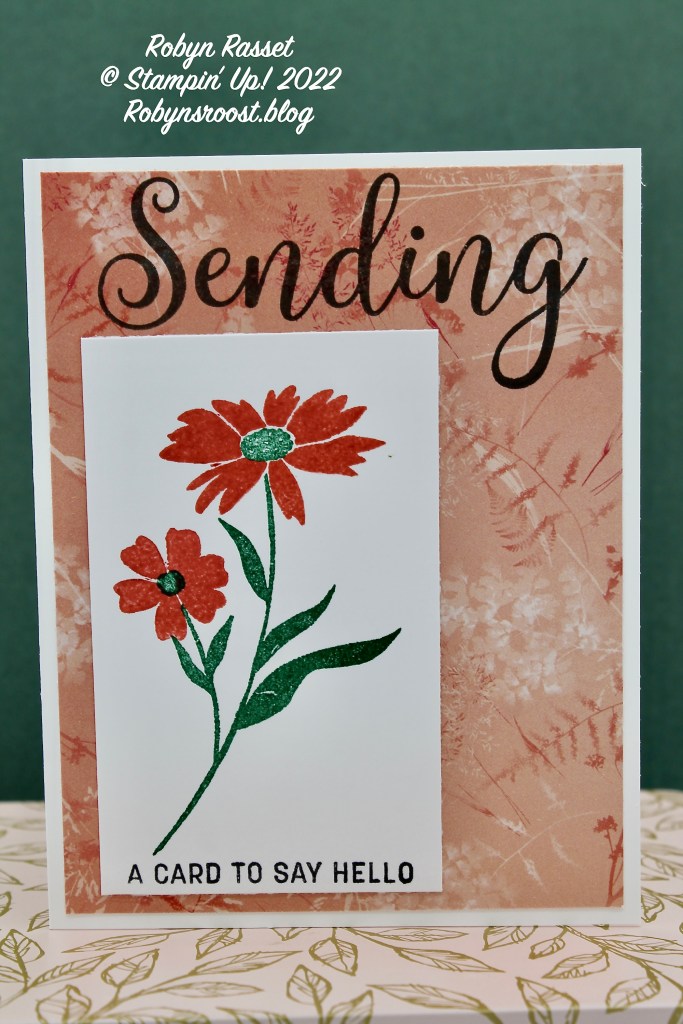 There are 3 colors of ink used on this card, Tuxedo Black for the words, Shaded Spruce for the leaves and flower centers, and Calypso Coral for the flower petals. The ‘g’ in sending swooped down too low to center the white flower layer so it is positioned off to one side.