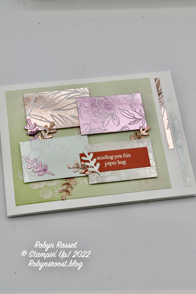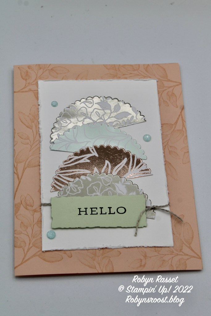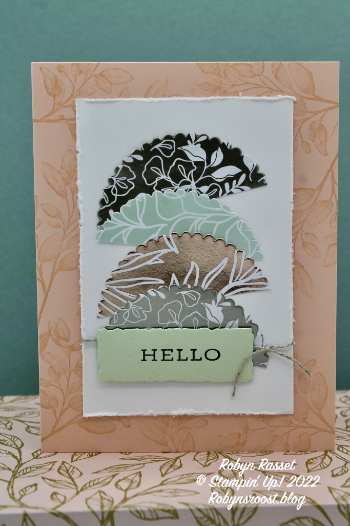 The Splendid Day Designer Series Paper is just gorgeous. This card really shows off the colored foils and the white designs on the foils. This card was meant to use the really cool half moon die from the Splendid Day Suite Die set (which I don’t have). Instead, I used one of the Layering Circles Dies and cut half circles, but they don’t have the same impact without the fun stitching. The greeting is from the Forever Fern stamp set and the label it’s on was cut using one of the Deckled Rectangle Dies.