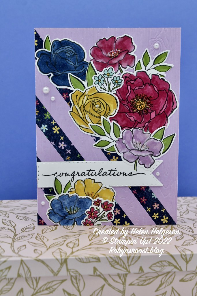 These swap cards are using products from the 2022-2023 Annual Catalog. I couldn’t decide which of the two Hues of Happiness cards I should share so I decided to share both. This card created by one of my Hollywood Stamping Chicks, Helen Helgeson combines the Hues of Happiness Bundle with the Timber 3D Embossing Folder. The flowers are colored with Stampin’ Blends and then covered in Wink of Stella for a fun sparkle that the camera just doesn’t catch.