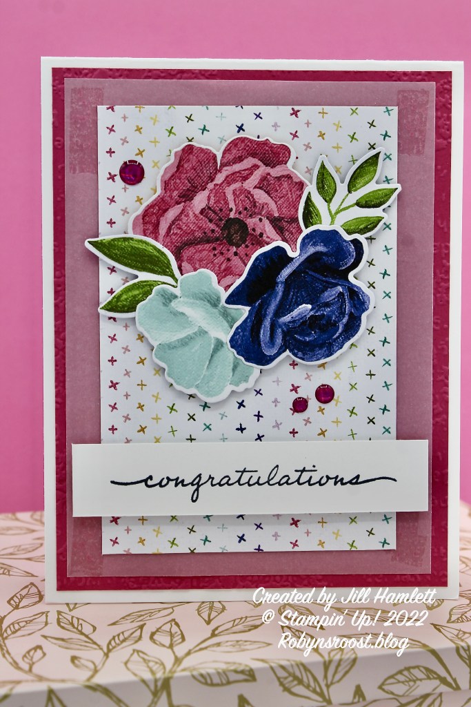 Jill Hamlett’s Hues of Happiness card uses Die cut flowers from the pretty designer series paper for a quick, no coloring, card. Jill also chose to use an embossed background with the Timeworn Type 3D Embossing Folder with a piece of the Layering Vellum over it.