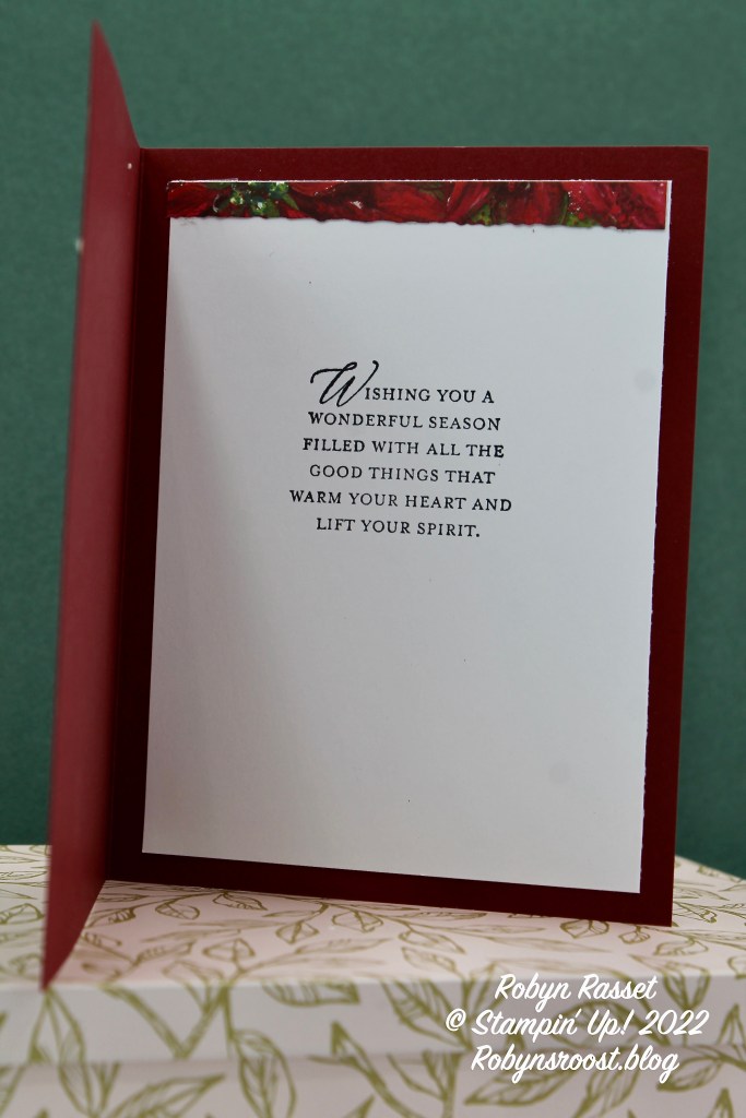 The Regal Reindeer stamp set also has this beautiful inside verse, love it! A little strip of the Boughs of Holly DSP brightens up the inside of the card. One edge is cut with one of the Deckled Rectangle Dies.