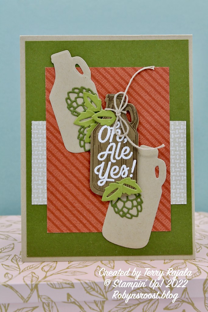 This fun card was created by fellow Minnesotan Terry Rajala and features the Brewed For You Bundle. The greeting is heat embossed with White Embossing Powder and the jug has a bit of Linen Thread wrapped around the neck and tied in a bow. The two pieces of patterned paper are cut 3″ x 4″ and 2″ x 3 3/4″. I like the perpendicular placement of the two patterned paper under the jugs.
