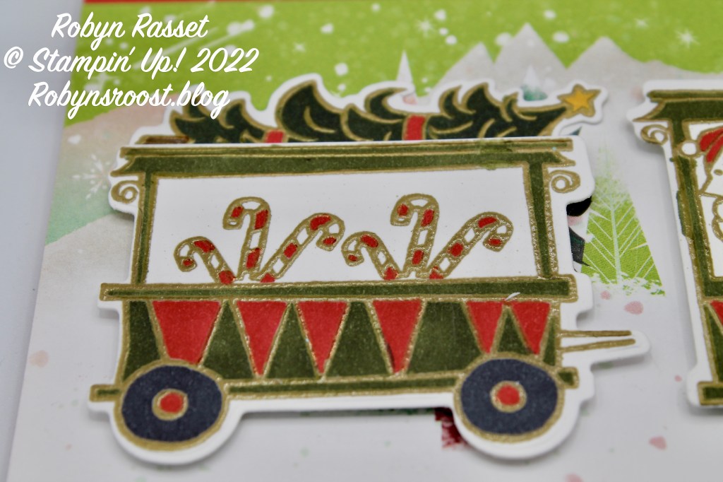 Next, I colored in the images with Stampin’ Blend Markers, then cut them out with the matching Santa’s Train Dies. I timed myself and it took 10 minutes to do the coloring for one card. Watch my Santa’s Express Video Tutorial to see the card being created.