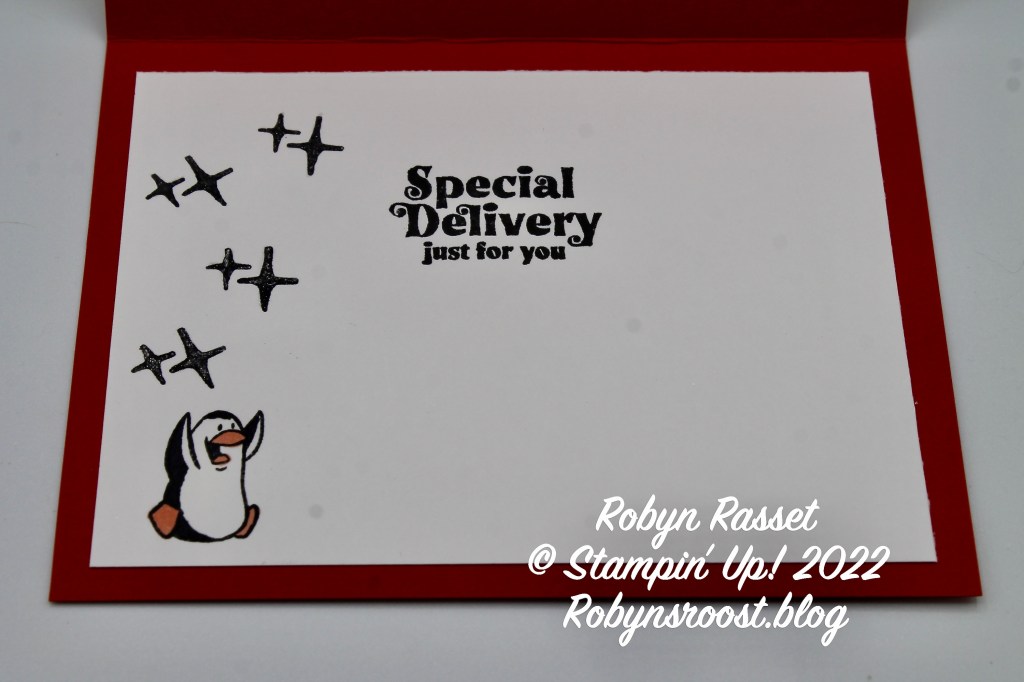 I just had to get this cute little excited penguin on the card somewhere, so I added him on the inside. The little sparkles even have Wink of Stella added to them but of course it doesn’t show in the photo.