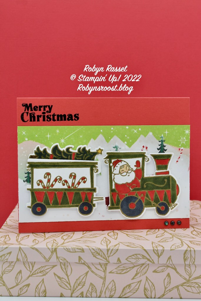 The fun background is from the Santa Express Designer Paper. The 12″ x 12″ sheet has 4 rows of these fun scenic strips that are 3″ tall. This allowed me to get 8 cards from each sheet of DSP (Designer Series Paper).
