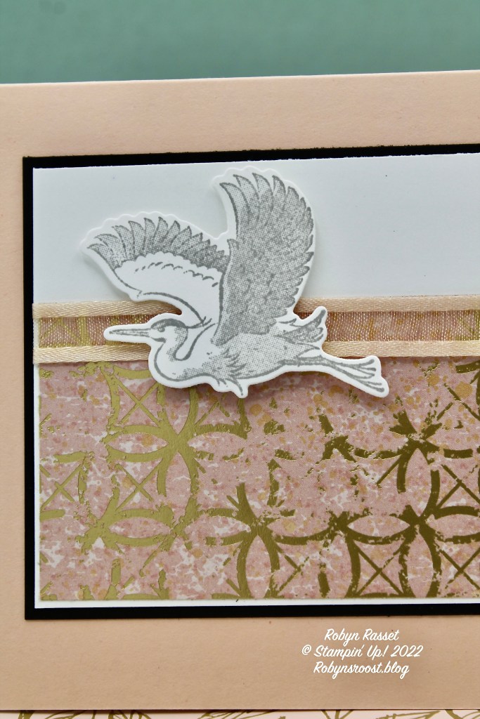 Even though the Petal Pink inside the card is light enough to write on, I chose to add a white liner to coordinate with the card front and added another strip of the Texture Chic paper with a little bird from the Heron Habitat stamp set. The birds are both stamped with Smoky Slate ink but I wanted the greeting to be a bit darker and used Basic Gray.