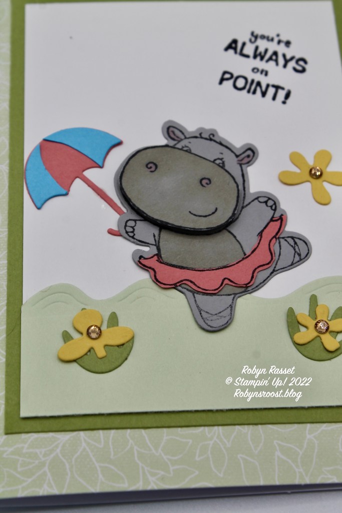 By stamping the hippo on Smoky Slate cardstock the only coloring that was needed was on the nose and belly using a Light Smoky Slate Stampin’ Blend Marker. Just a bit of Flirty Flamingo was added to the nostrils and ears. There are tons of fun accent dies in the die set including the umbrella and flowers shown here. The top of the grass is cut with a border die which makes great waves but also worked well for the grass.