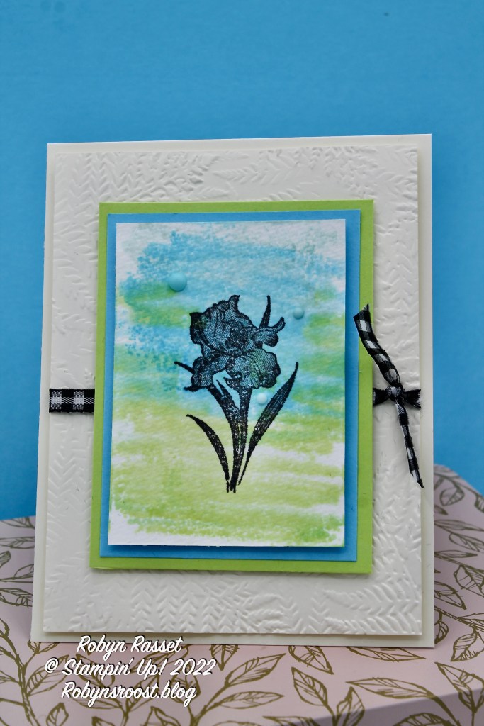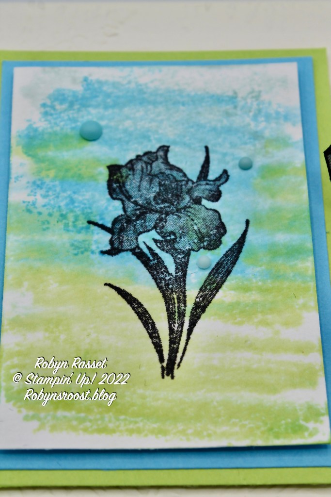 The markers used on this piece are Tahitian Tide, Pool Party and Parakeet Party, with the iris being stamped in Tuxedo Black ink. Many variations can be achieved with different amounts of water. More water will give a softer more smeared, runny look, less water gives a more speckled look.
