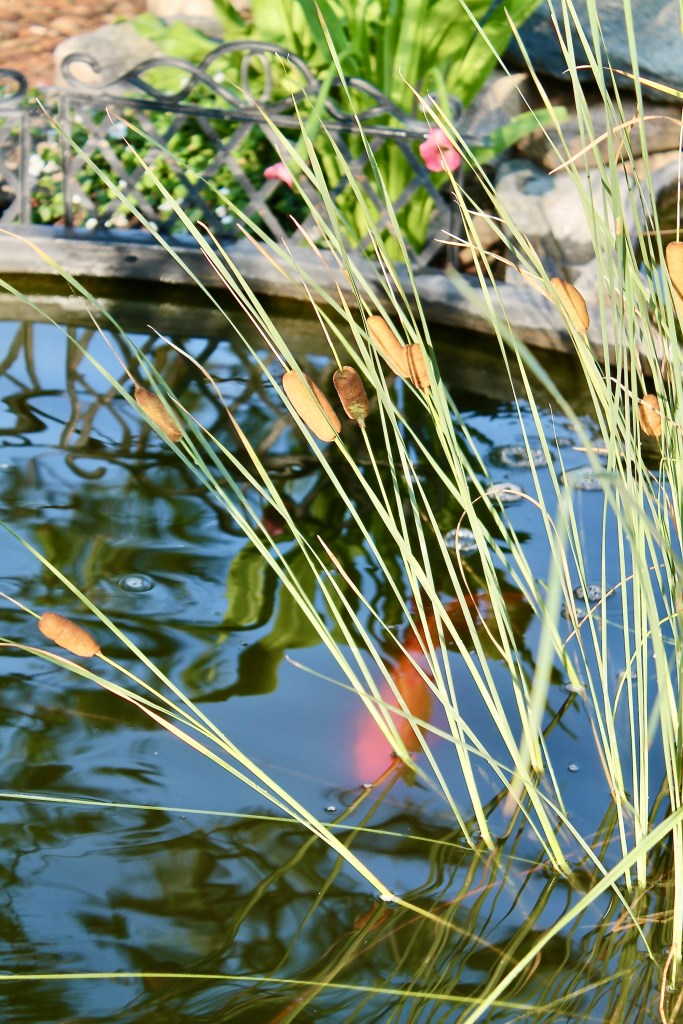 These cattails are about the only plants that I’m able to put in the big pond anymore. The fish tend to eat the water lilies and dig them out of the pots so they are now in the lower pond.