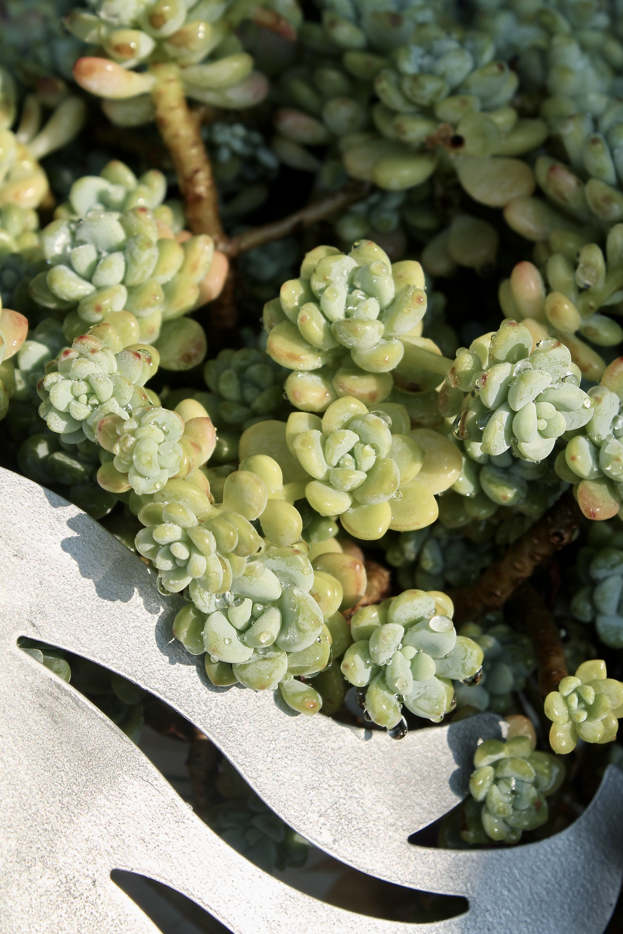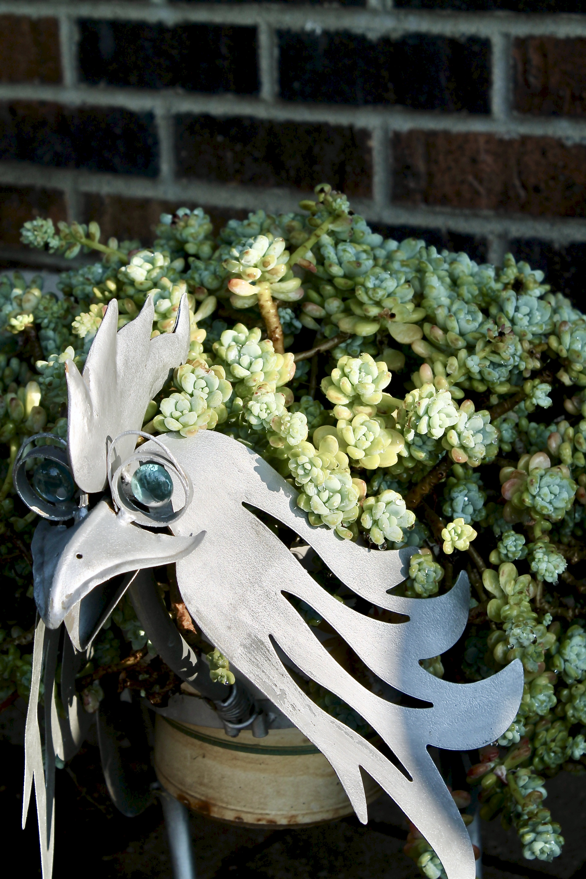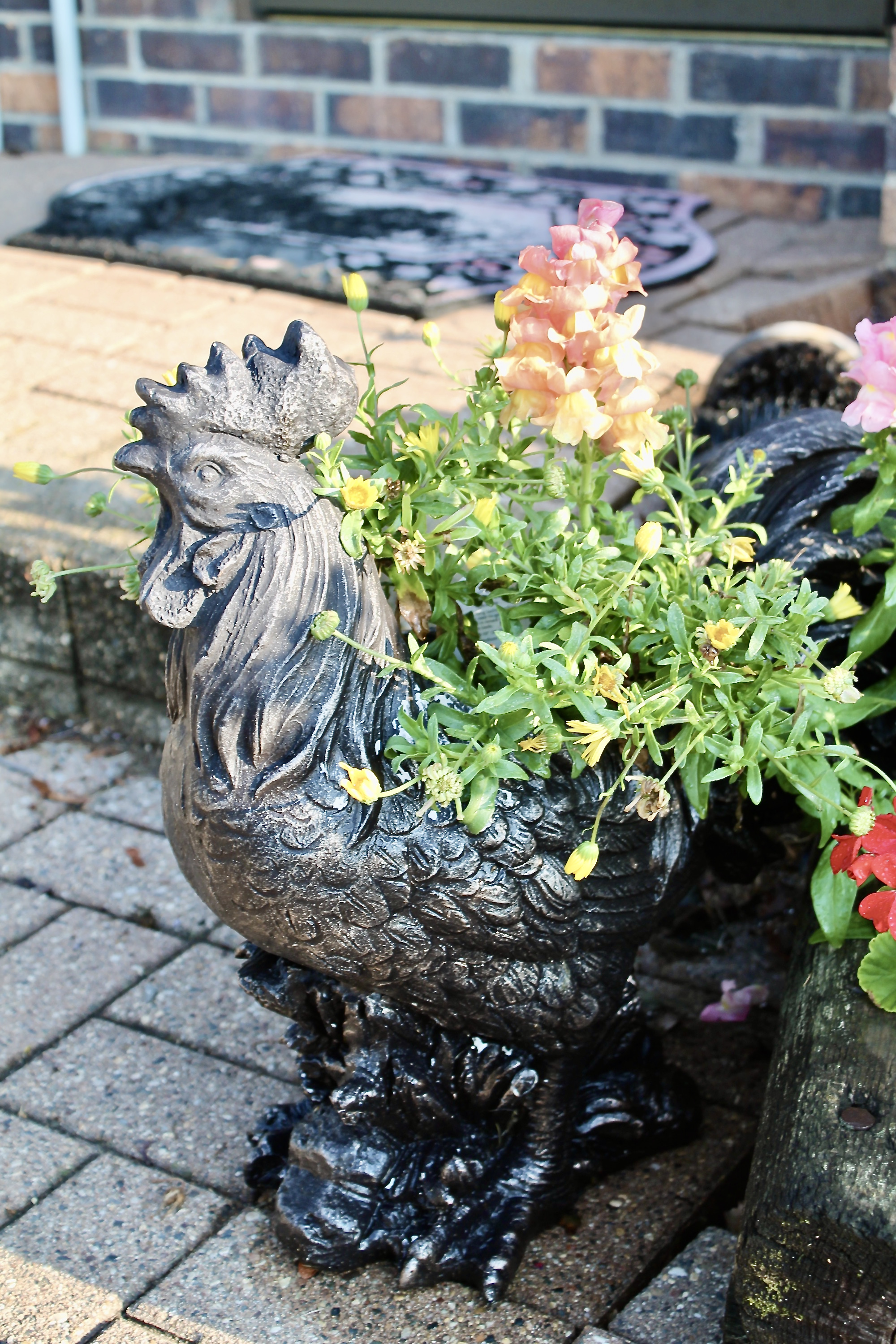 Right outside my front door, I have 2 roosters standing guard. They require daily watering and are the only plants that I have in pots. The Burro Tail is very old and goes back and forth between house plant and outside plant every year.