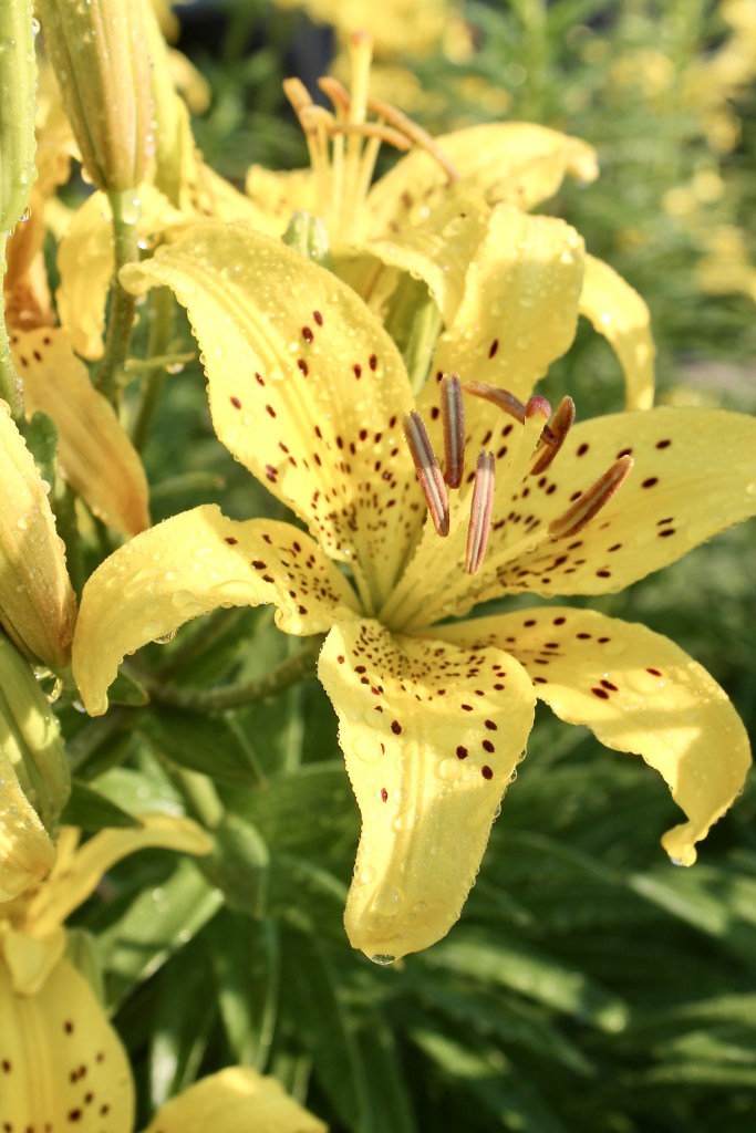 The Asiatic Lilies in my oval bed have sort of taken over. There were a few orange ones earlier this summer but now the yellow ones are blooming. They have almost pushed out a pretty yellow flowered bush that I received from Kristin a co-worker who was also an avid gardener. I don’t remember the plant name but I’m going to have to find it a new home or beat back the lilies, lol.