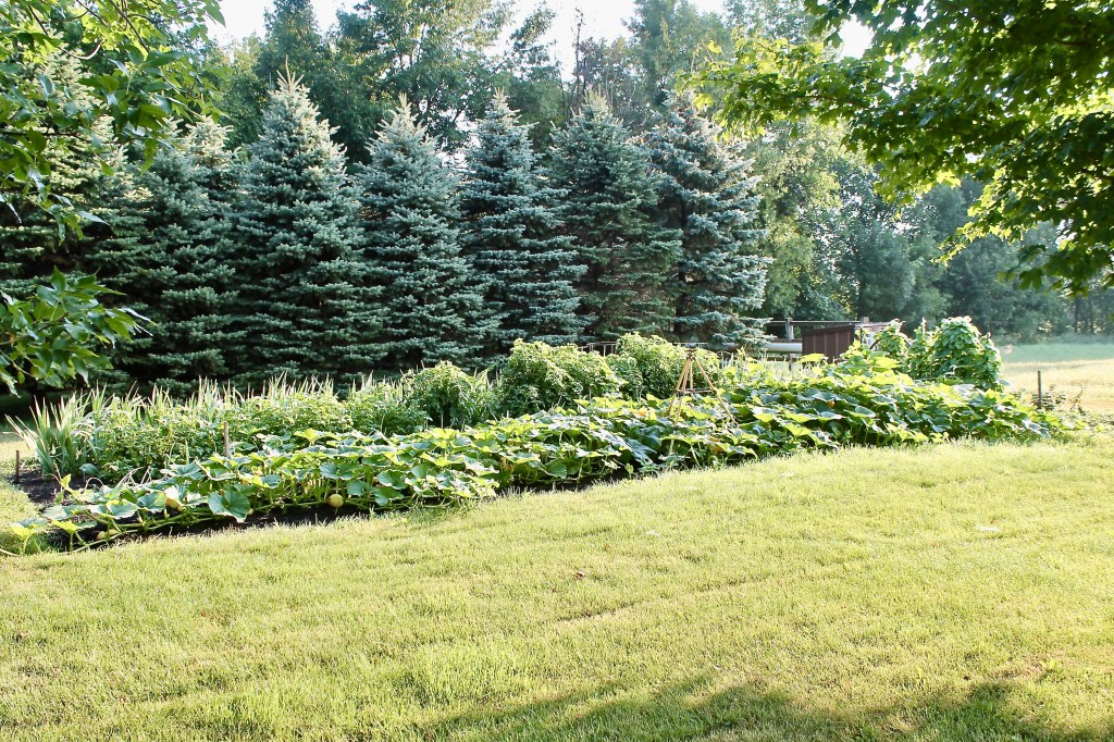 My vegetable garden doesn’t have as many vegetables as it used to. With our plans to spend our winter in Florida I don’t really need to put up a whole freezer full of vegetables. It’s about 1/3 pumpkins, 1/3 flowers and then 1/3 tomatoes, potatoes, carrots, onions, and peas (that didn’t come up).