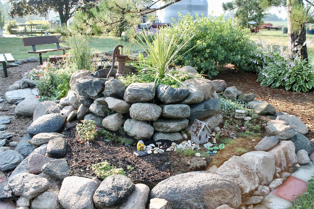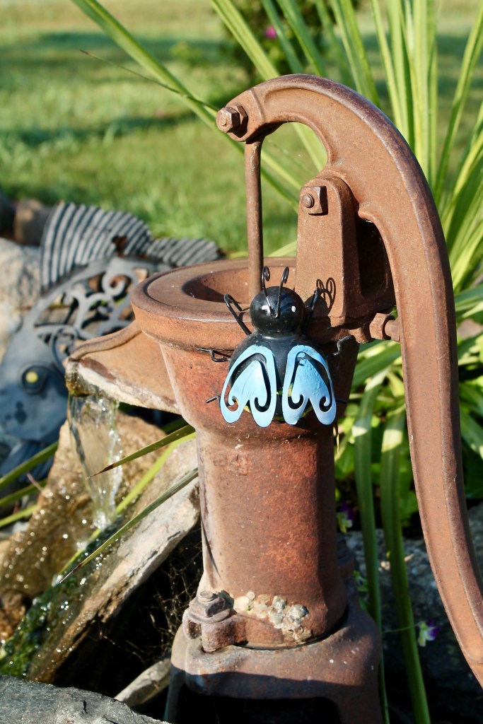 This old hand pump has been here on the pond since the beginning but this little ladybug just landed here this year, a birthday gift from the kids.