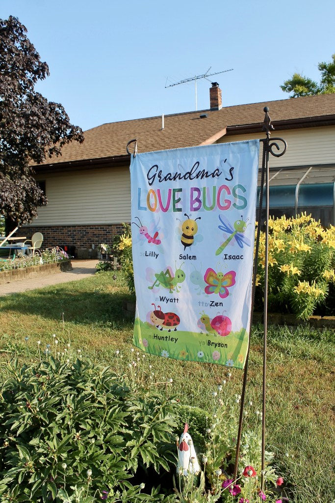 This bed is sadly in need of deadheading or snipping of the flowers that are done blooming. Maybe later today? I wanted to share my fun garden flag with all of my grandkids names.