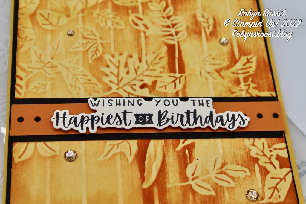 The little dots on the orange strip are actually holes, created by one of the dies in the Sentiment Silhouette Dies which coordinates with the Charming Sentiments stamp set. This fun bundle takes the fussy cutting out of these cool sentiment stamps plus adds in some fun dies like this little border, a candle, flowers, hearts and stars. Best of all when you buy them together in a bundle you save 10%! Be sure to watch this card being created on my Carved Wood Technique Video Tutorial.