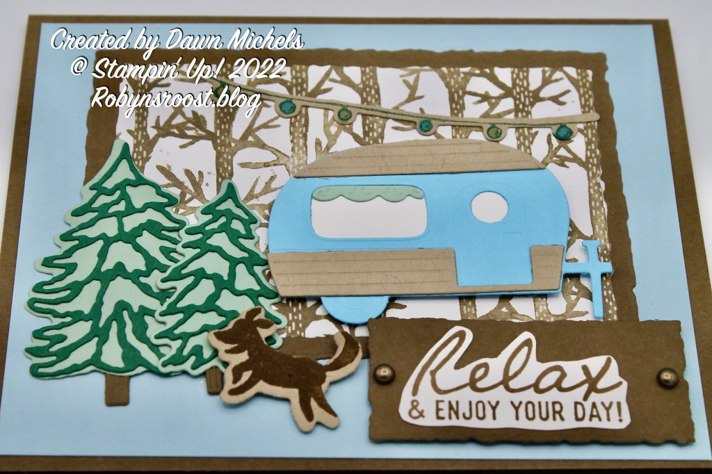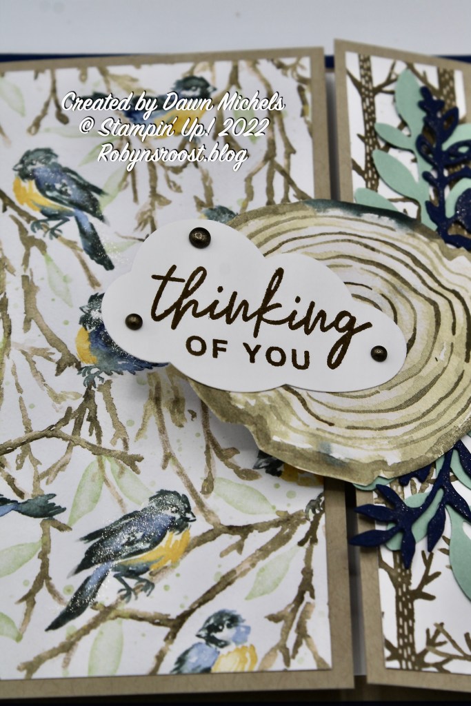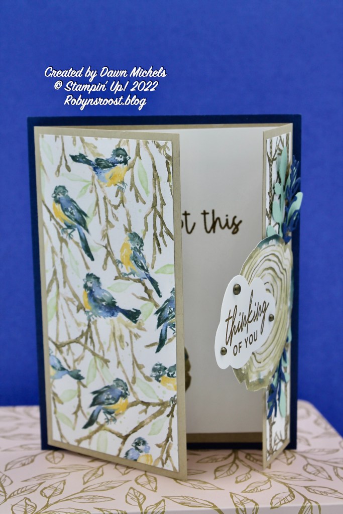 Dawn’s card features the gorgeous woodsy Rings of Love SALE-a-bration paper which coordinates with the Ringed with Nature Bundle but is an awesome stand alone product too. The greeting is from the Ringed with Nature stamp set and was punched out with the Cloud Punch. Dawn has used a fun fold layout that I thought interesting so here are the paper dimensions for you: