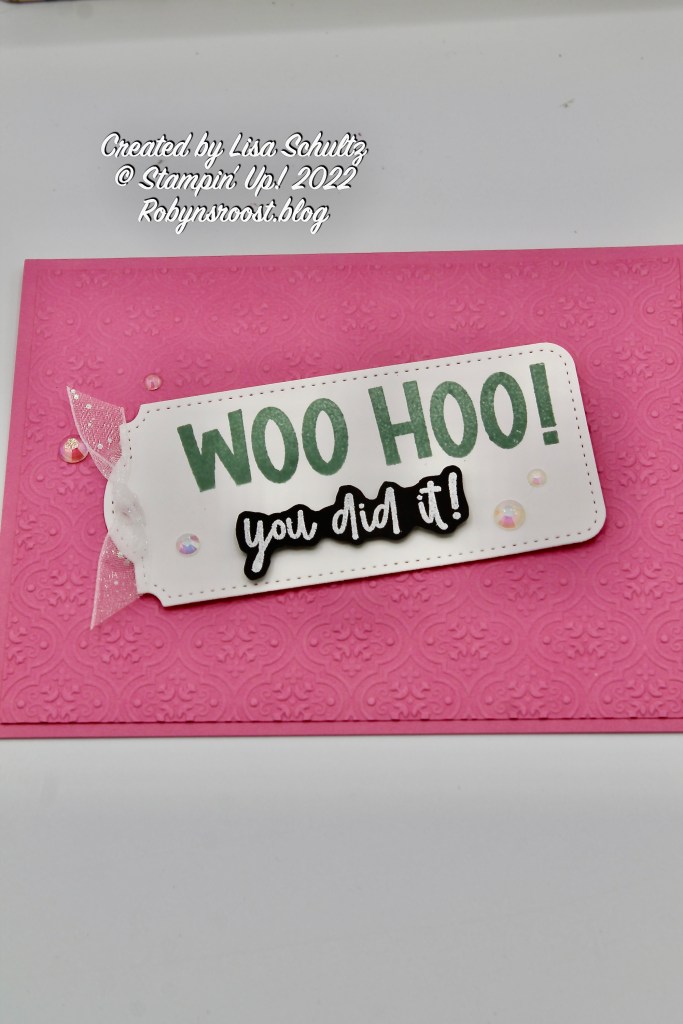 The big Woo Hoo! that Lisa used on this quick and cute card is from the Amazing Phrasing $100 Level SALE-a-bration stamp set. The smaller greeting is from the fun Charming Sentiments Bundle (let the matching dies do the work cutting out these phrases!) The greetings are layered onto a tag cut with the Tailored Tags Punch.