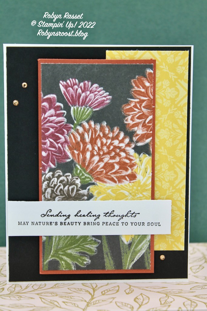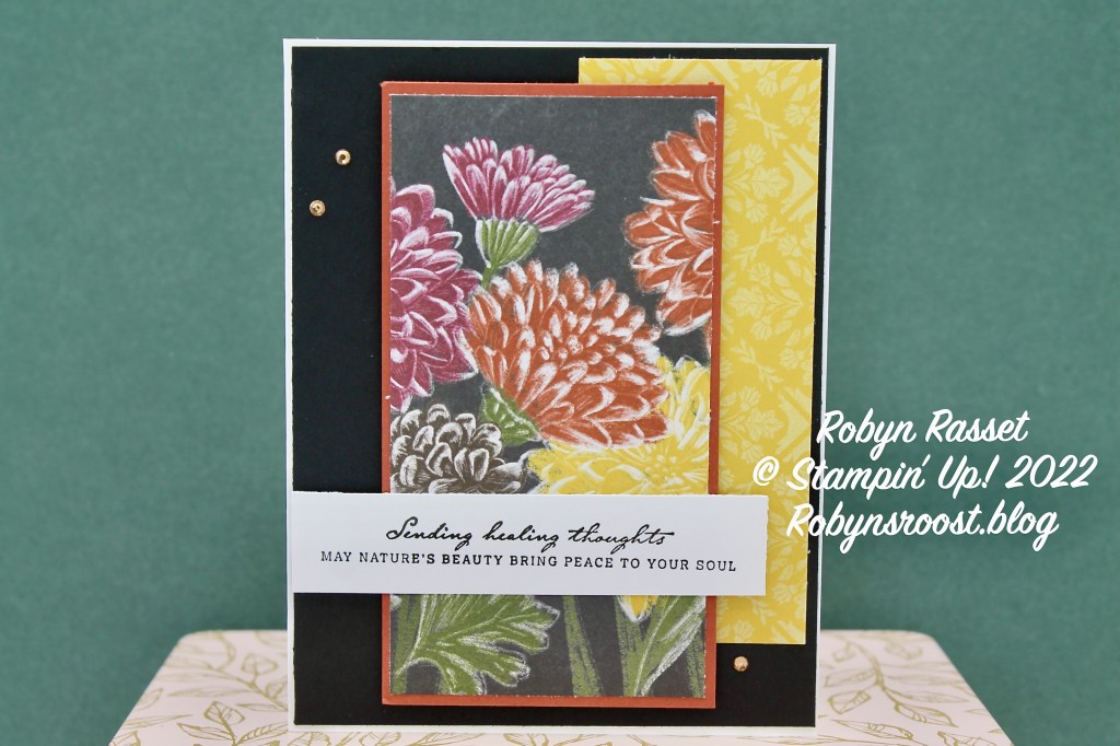The Cajun Craze matted layer and the DSP are adhered together and then popped up with dimensionals. The greeting has dimensionals added to the ends and Stampin’ Seal to the middle. The greeting is from another harvest themed product, the Nature’s Harvest stamp set. As a finishing touch 3 Champagne Rhinestone Jewels are added for a little sparkle.