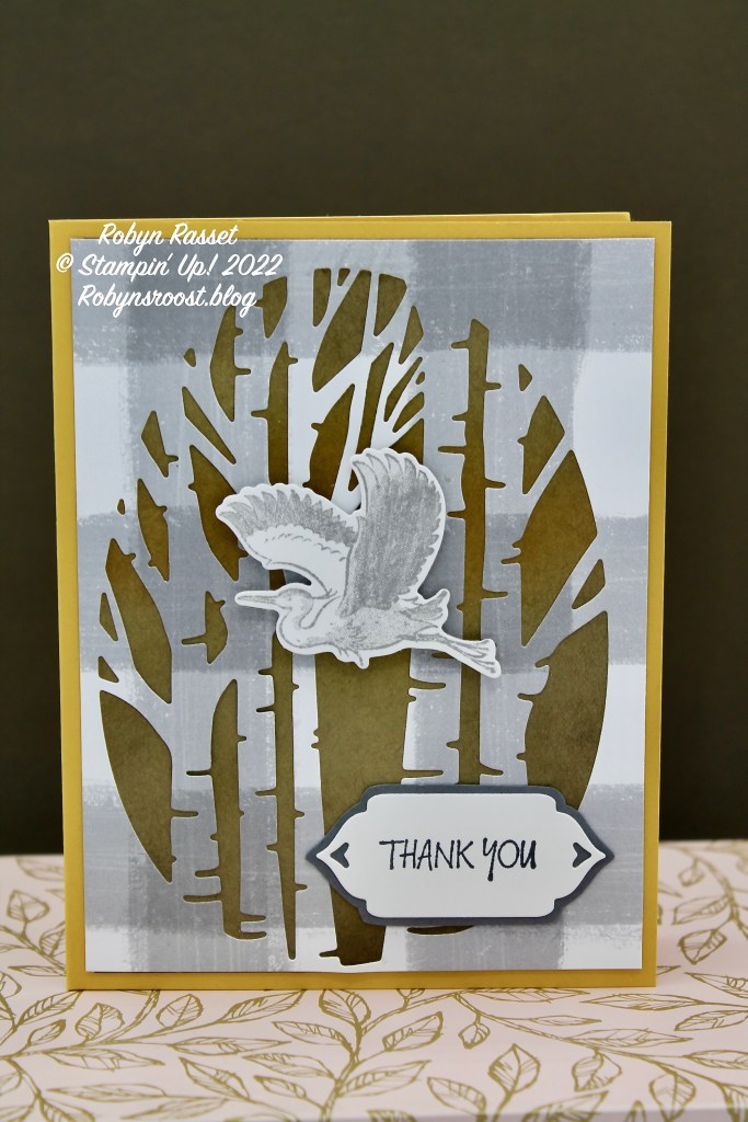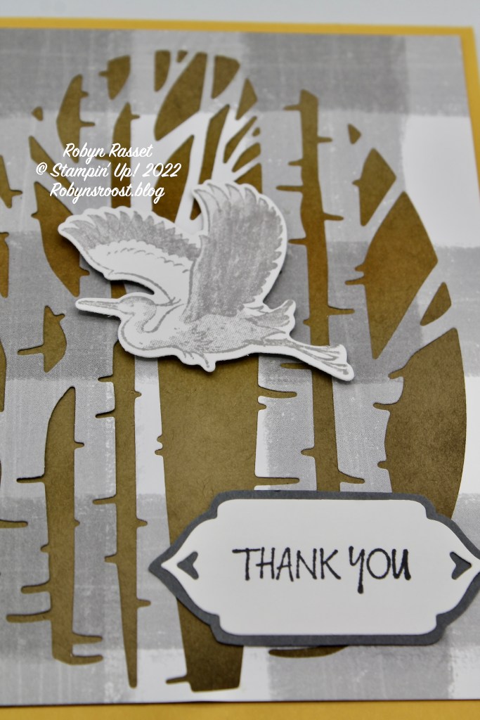 The Heron and greeting are from the Heron Habitat Bundle. To make the gray shadow layer for the label, the die cut thank you label was adhered to a piece of Basic Gray and then fussy cut to leave a narrow edge. The Heron is popped up with dimensionals but the the greeting is left flat.