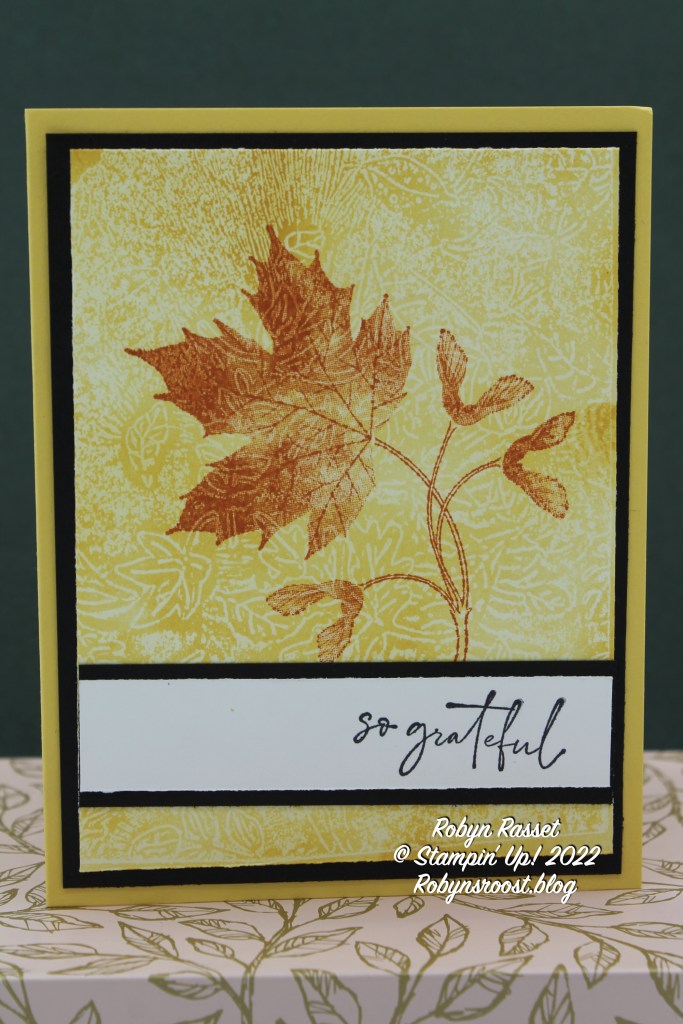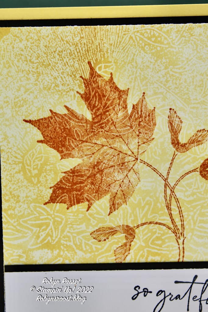 Use a Blending Brush and rub ink (Daffodil Delight here) over the Basic White paper to reveal the designs from the embossing folder. Stamp the leaf using Pumpkin Pie ink. Both pieces of paper will have designs so you can make two cards. Here are all of the paper dimensions:
