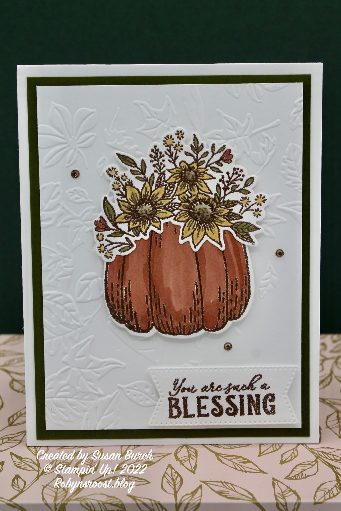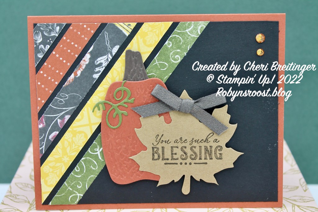 Cheri’s card uses one of the leaves from the Leaf Labels and Amber Gem Combo Pack. With a bow covering the hole in the top of the leaf. Notice the fun embossing on the pumpkin and stem? Those dies in the Rustic Pumpkin Die set do the embossing at the same time that they cut. The fun strips of patterned paper on the background are from the Rustic Harvest Designer Series Paper.