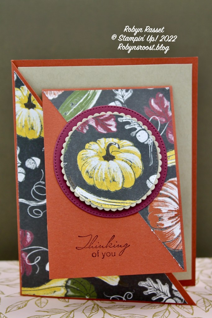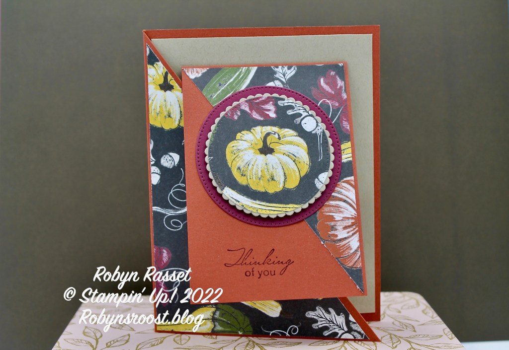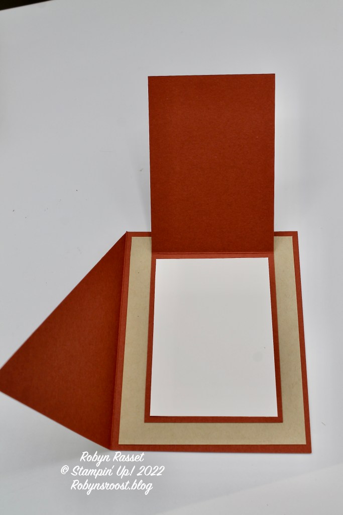 There are a couple of ways to cut the triangle of Rustic Harvest DSP for the small flap. Use the top half of the diagonally cut Rustic Harvest piece to create the triangle for the inner card by measuring 2 7/8″ from the right top to left top, make a mark. Measure from the top right to the bottom, down 4 1/8″. Then cut off the strip on the long side from one mark to the other. OR, cut a new piece of DSP 2 3/4″ x 4″ and cut on the diagonal from the top left to the bottom right. Remember that the direction of the pattern on the DSP is going to be important! It’s easiest if you choose a DSP that doesn’t have a directional pattern.