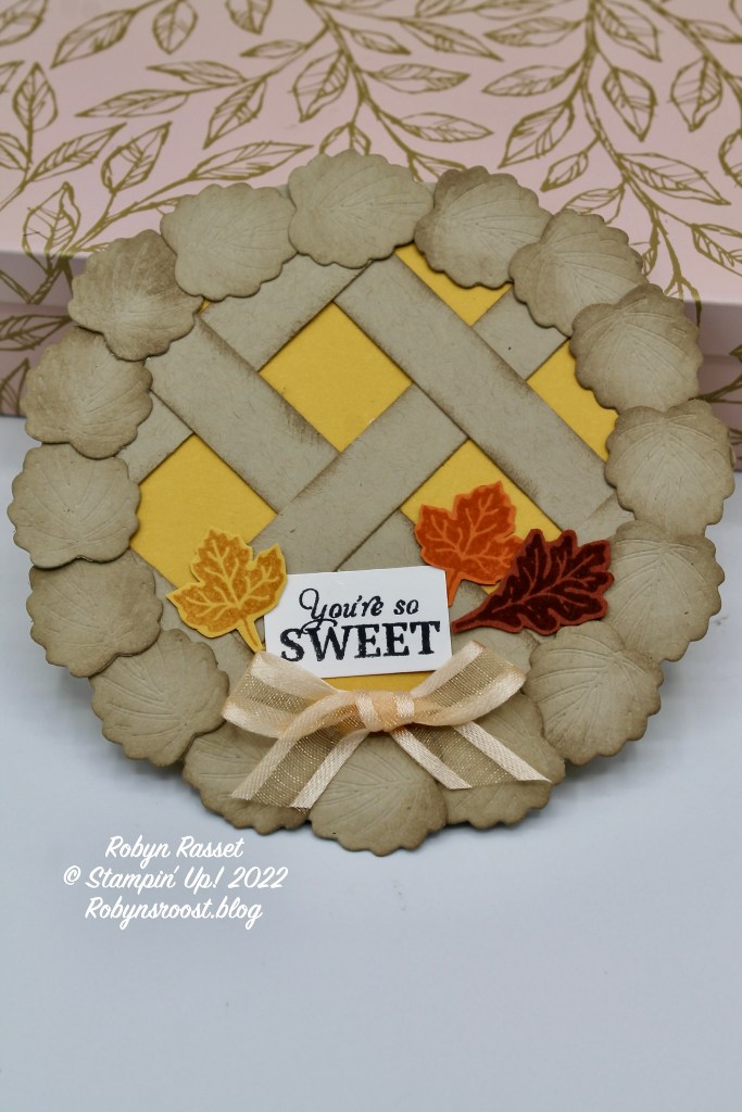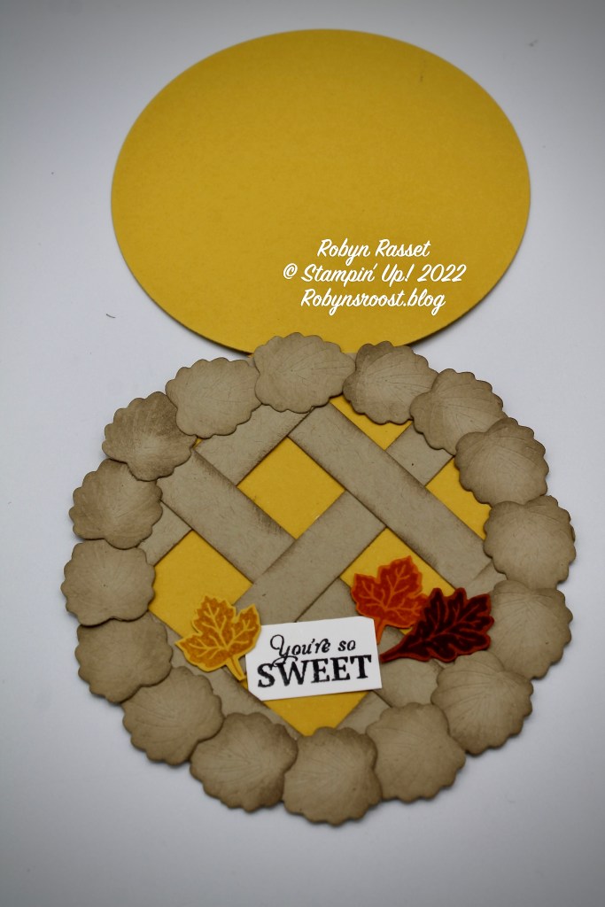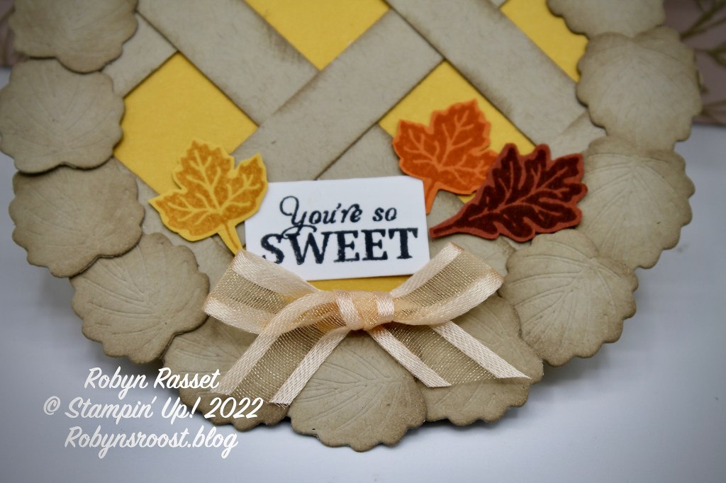 In this photo you can see how the card opens with the hinge that was left. The lattice strips are 1/2″ wide and there are 6 of them. The 16 Crumb Cake leaves are cut using the Pansy Die set. The edges of both the leaves and lattice strips have been colored with Crumb Cake ink and a sponge dauber to make them looked browned.