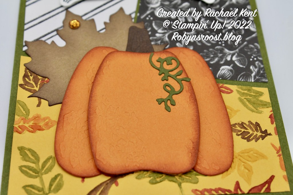 The texture and coloring on this card is amazing! The Leaf Label has sponged edges as well as the pumpkin. The center of the pumpkin is raised up with dimensionals for a 3D appearance, as well as the greeting.