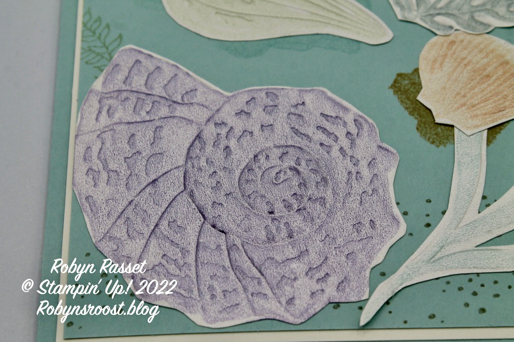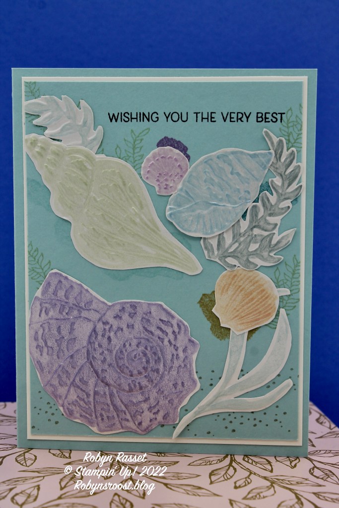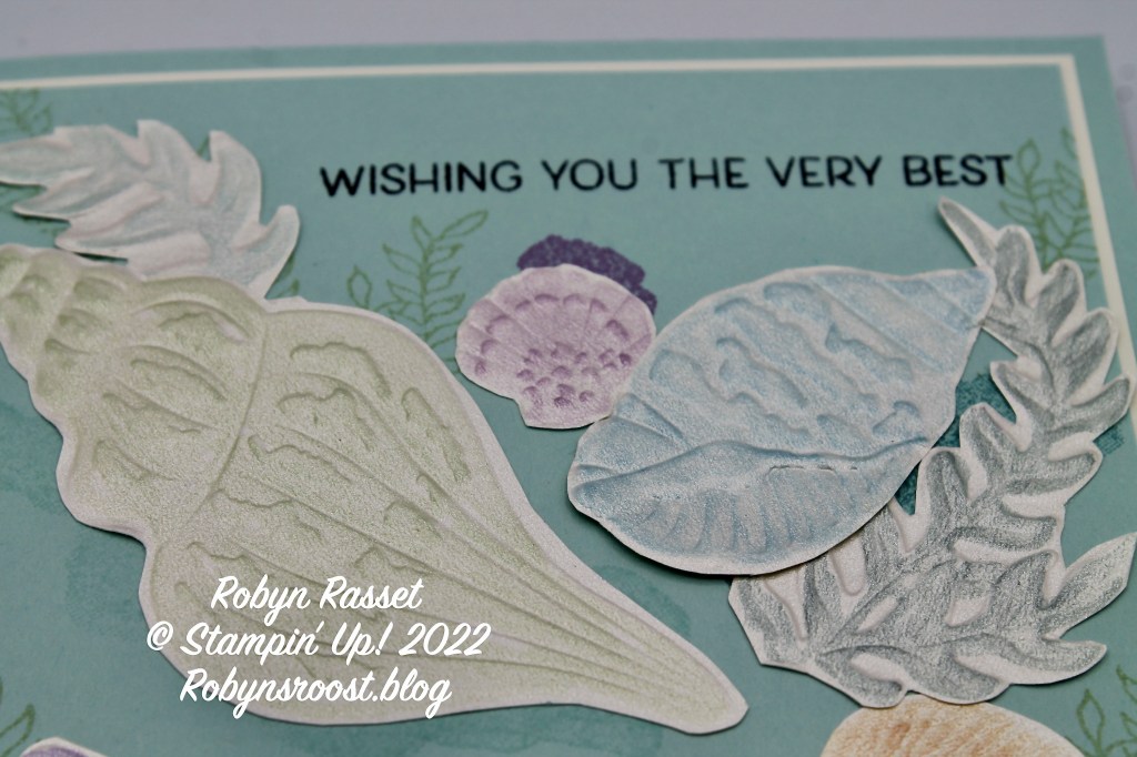 The shells are layered onto a 3 7/8″ x 5 1/8″ piece of Pool Party Cardstock which has a greeting stamped with Tuxedo Black ink on the top right corner, sand dots done with Sahara Sand ink across the bottom, random greens stamped with Soft Sea Foam and some of the blotch stamps from the stamp set stamped in colors matching the shells. These blotches are used to cast shadows behind the shells.