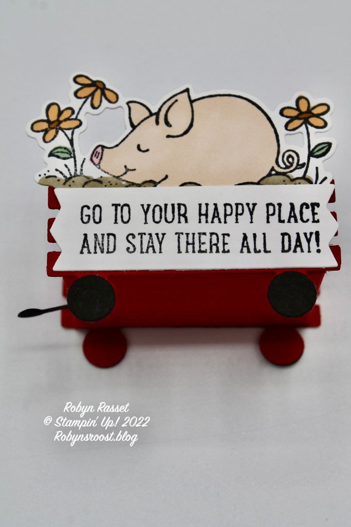 I knew right away when I started thinking of ideas for party favors for the Hollywood Stamping Chicks first ever Hobby Day that I wanted to make a 3D wagon using the Playful Piggy Dies. It took me a little experimenting to get the base the right size to fit the wagon and an ink spot and candy, but I finally ended up with a 3″ x 2 1/4″ base. All 4 sides are scored at 1/2″. I didn’t even look at the greetings until I had the wagon made and pig colored and then found this greeting. What a perfect greeting for a table favor for an all day crafting event!
