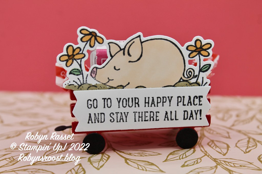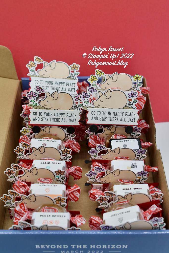 Here is my passel of pigs ready to welcome the ladies to Hobby Day. Each wagon held an ink spot and a carmel. Watch my Piggy Wagon video tutorial to see how to make them.