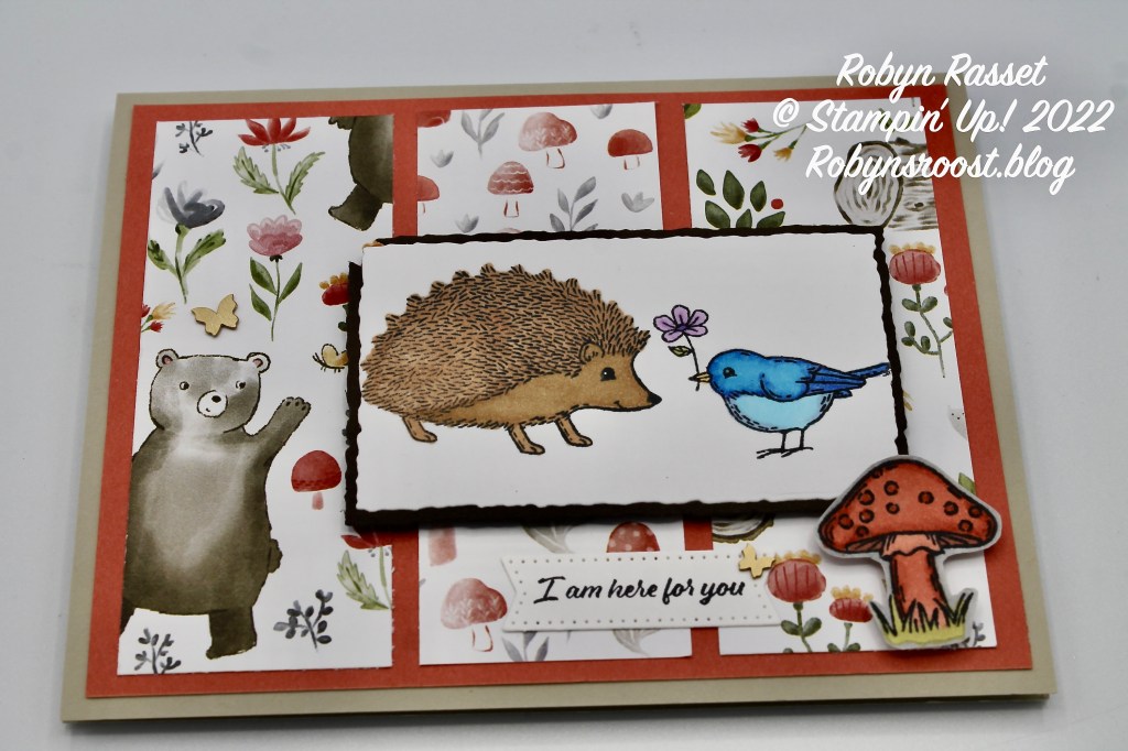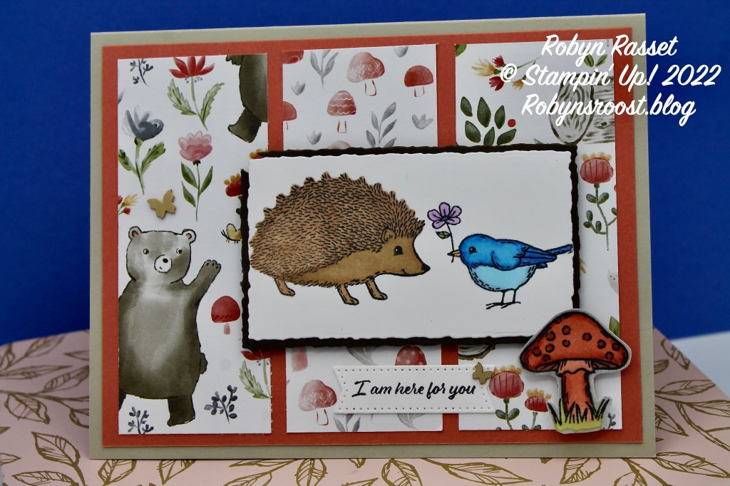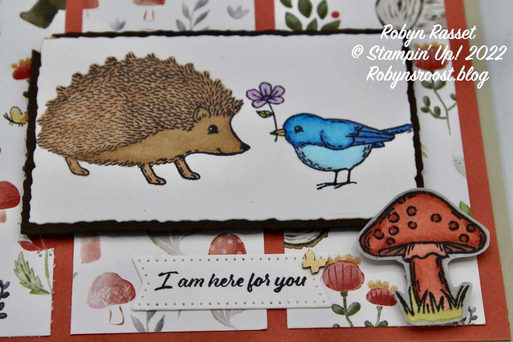 For today’s card, I’ve combined the Happy Forest Friends Designer Series Paper with the Happy Hedgehogs stamps. The Happy Forest Friends Suite is found on pages 46-47 of the 2022-2023 Annual Stampin’ Up! Catalog. It’s a fun whimsical nature suite with stamps of an owl, bear and fox as well as mushrooms and tree stumps. It’s one of the stamp sets that I haven’t gotten yet, but I did have to have the designer paper. The Happy Hedgehogs fit right in with the Happy Forest Friends DSP.