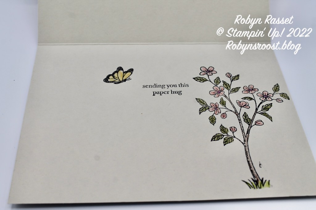 The greeting is from the Through It Together stamp set. This is one of my favorite go-to greeting sets! It has 21 greetings for many occasions. Another favorite is the Stylish Shapes Die set which was used to cut out the greeting. The Stylish Shapes Dies contain several sizes of these labels as well as squares and circles in layering sizes all with the pretty stitching. Can you find the 2 Brushed Brass Butterflies? I spend several minutes deciding which embellishments to add to this card and finally settled on the butterflies. They show up really well when the card is tipped but not so much in this photo.