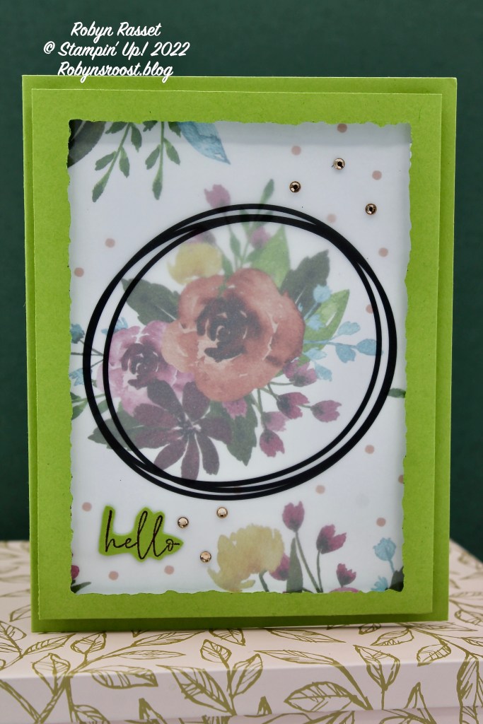 I’ve been wanting to use this design of the Lovely Layers Vellum to spotlight some pretty flowers for a while, and today is the day. The Vellum is 3 3/4″ x 5″ so I cut the designer series paper to the same size and adhered them together around the edges. Adhesive will show through the vellum so I covered the adhesive with a frame of Granny Apple Green which is 4″ x 5 1/4″ and has a Deckled Rectangle Die cut from the center. The frame is popped up using Foam Strips.