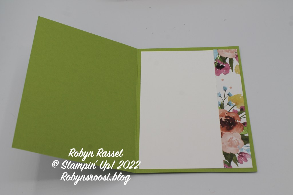 For the inside of the card, a 1″ x 5 1/4″ strip of the Awash in Beauty DSP was added to the edge of a 4″ x 5 1/4″ Basic White liner.