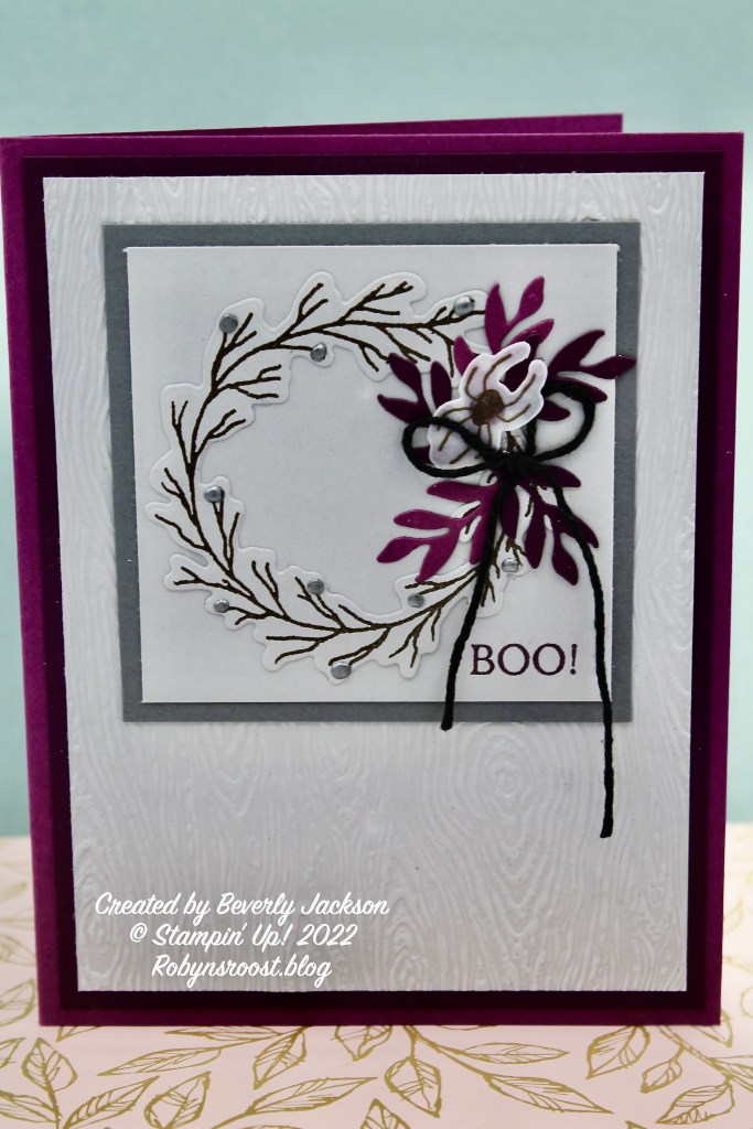 Beverly’s Halloween card starts with a Rich Razzleberry base followed by layers of Blackberry Bliss, Smoky Slate, and Basic Gray. The large Smoky Slate layer has been embossed with the Timber 3D Embossing Folder and the little spider is done on vellum. The little dots on the wreath are actually made with the Black color of the Pearlized Enamel Effects. They actually appear more silver than black, but are really cool. These would make great nails on a guy card! The stamping is all done with Early Espresso ink and the bow is done with Black Baker’s Twine.