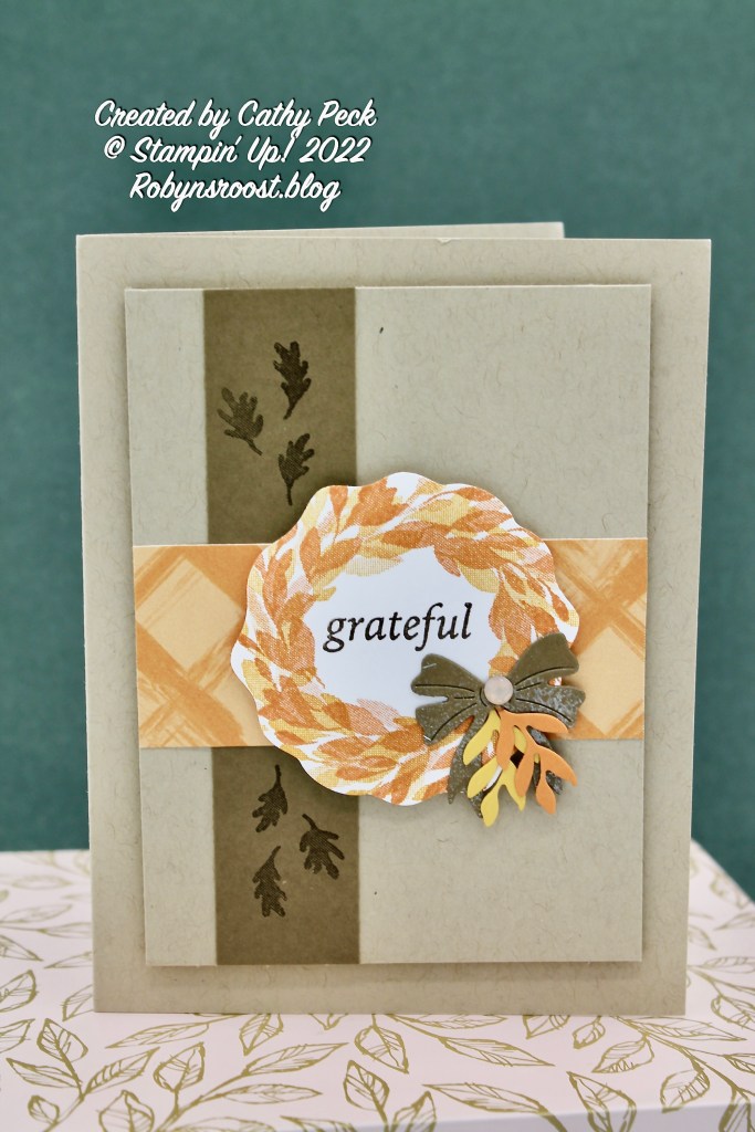 Cathy’s card made with the exact same stamp set has a totally different feel and theme for a thoughtful Thanksgiving card. The base and 3 1/2″ x 4 3/4″ layers are done in Crumb Cake cardstock with the layer floating on dimensionals. The 1″ x 4 3/4″ Soft Suede Strip has been stamped with the little oak leaves with Soft Suede ink. A 1 3/8″ x 3 1/2″strip of the Gingham Cottage DSP in Pumpkin Pie adds a nice pop of color.